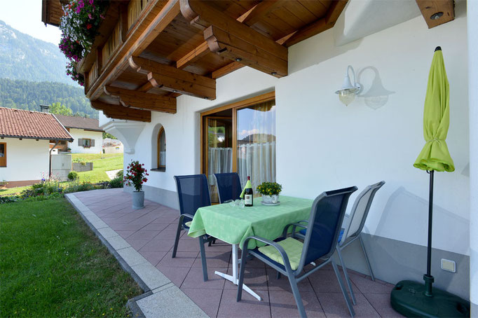 Den herrlichen Blick auf den Garten, den Berg Pendling und die Wiesen können Sie direkt von der